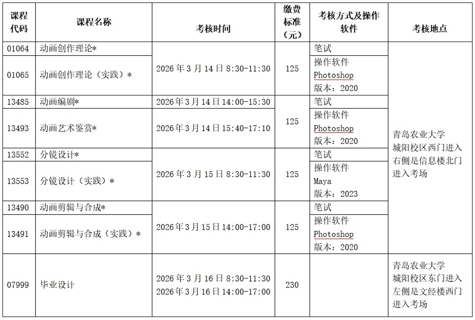 笔试和实践课程考试时间如下,考场地点:青岛农业大学本部(即城阳校区)信息楼靠近学校西门,可从校西门进入,右侧是信息楼(从信息楼北门到达考场)。考场名单表在信息楼北门张贴,请考生在此查看所在考场,并由此上楼。