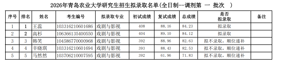 2026年研究生复试戏剧与影视调剂拟录取名单